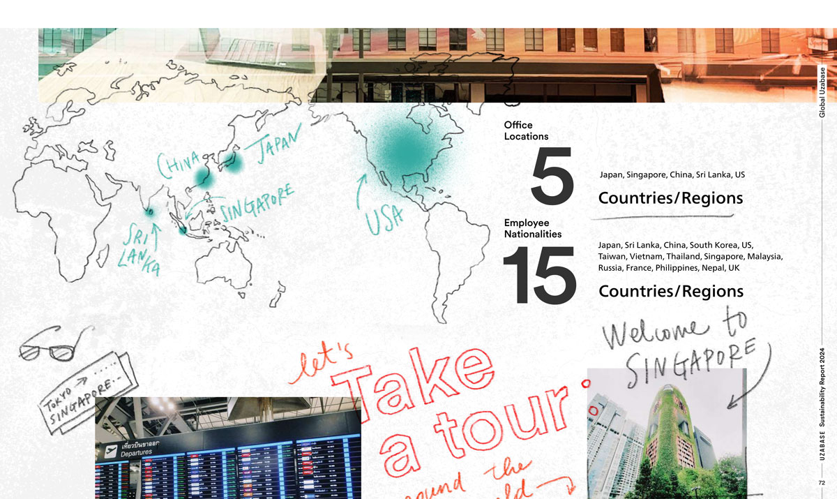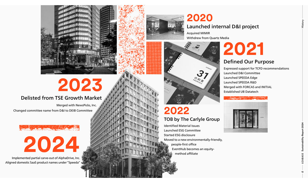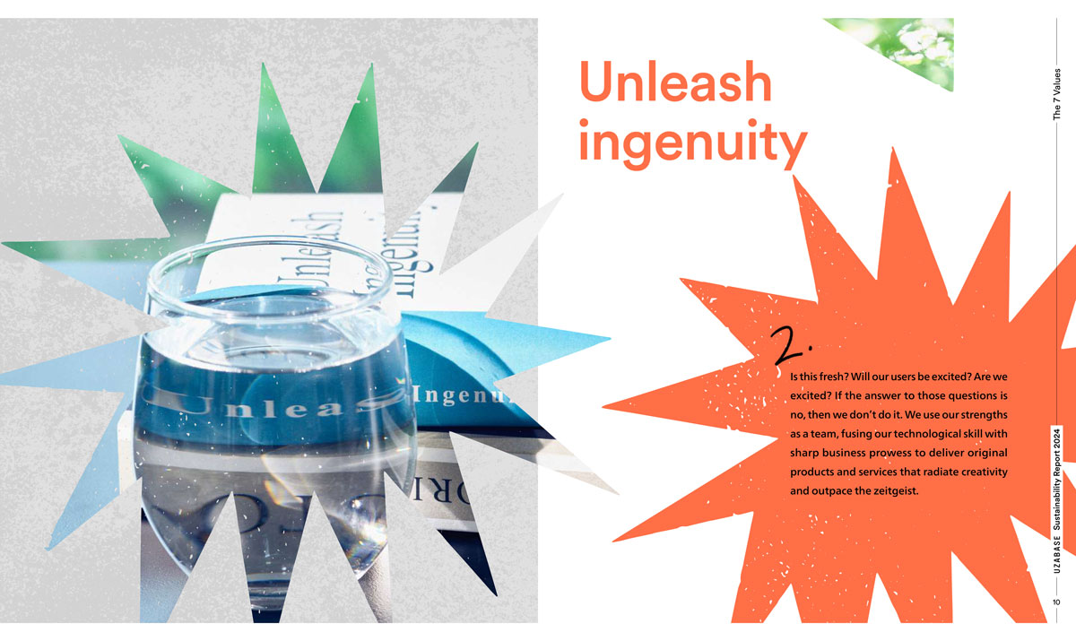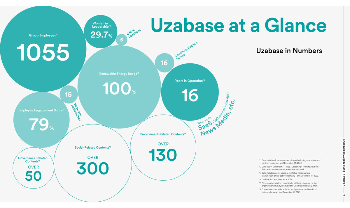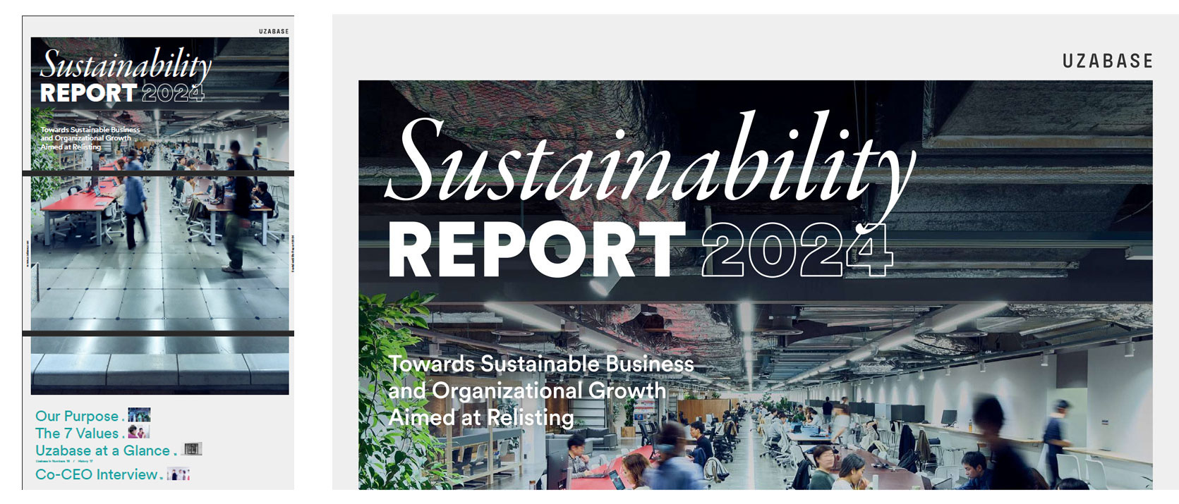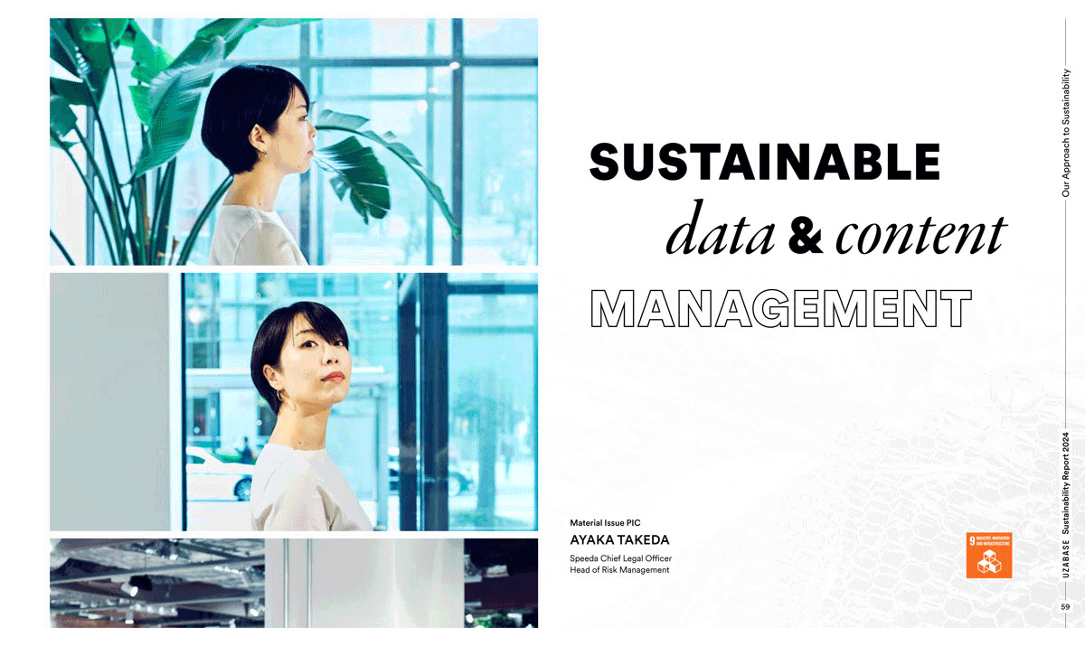 Uzabase’s 2024 sustainability report offers a screen-first horizontal design and a variety of photographic treatments to tell its story.