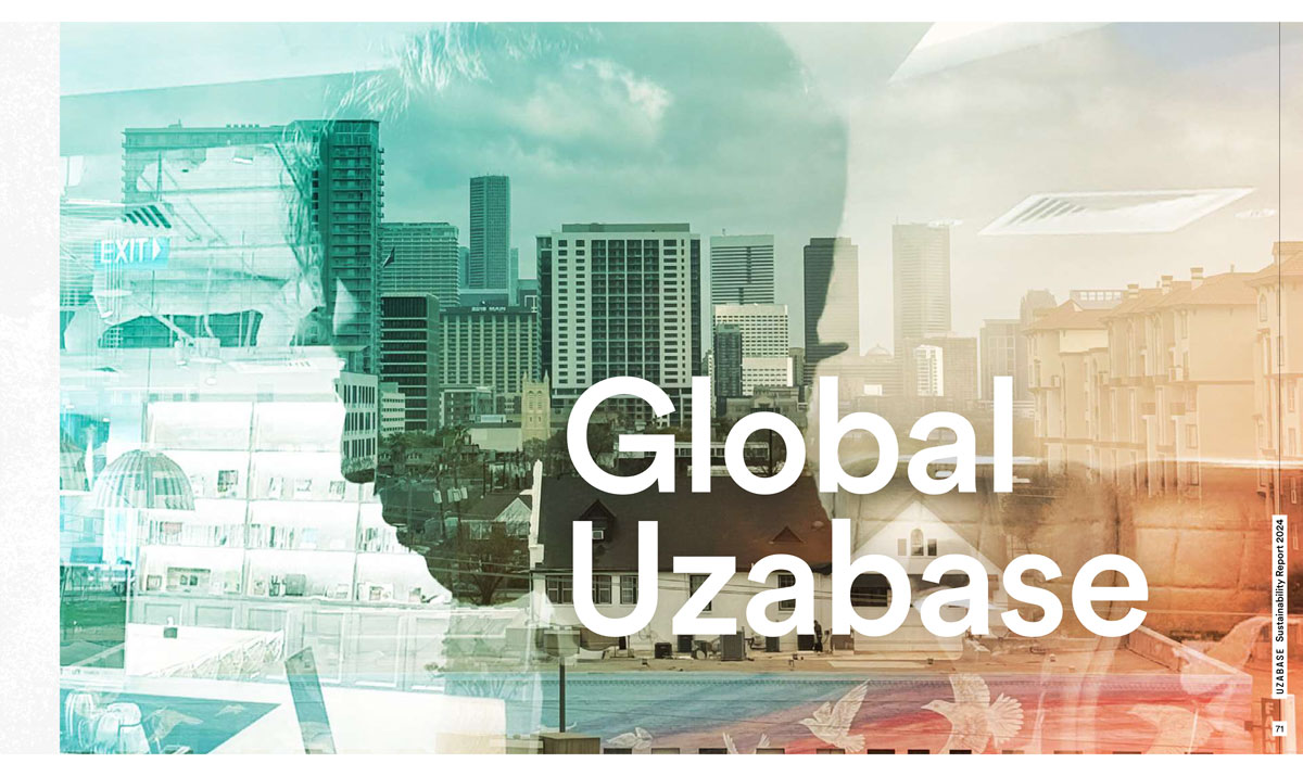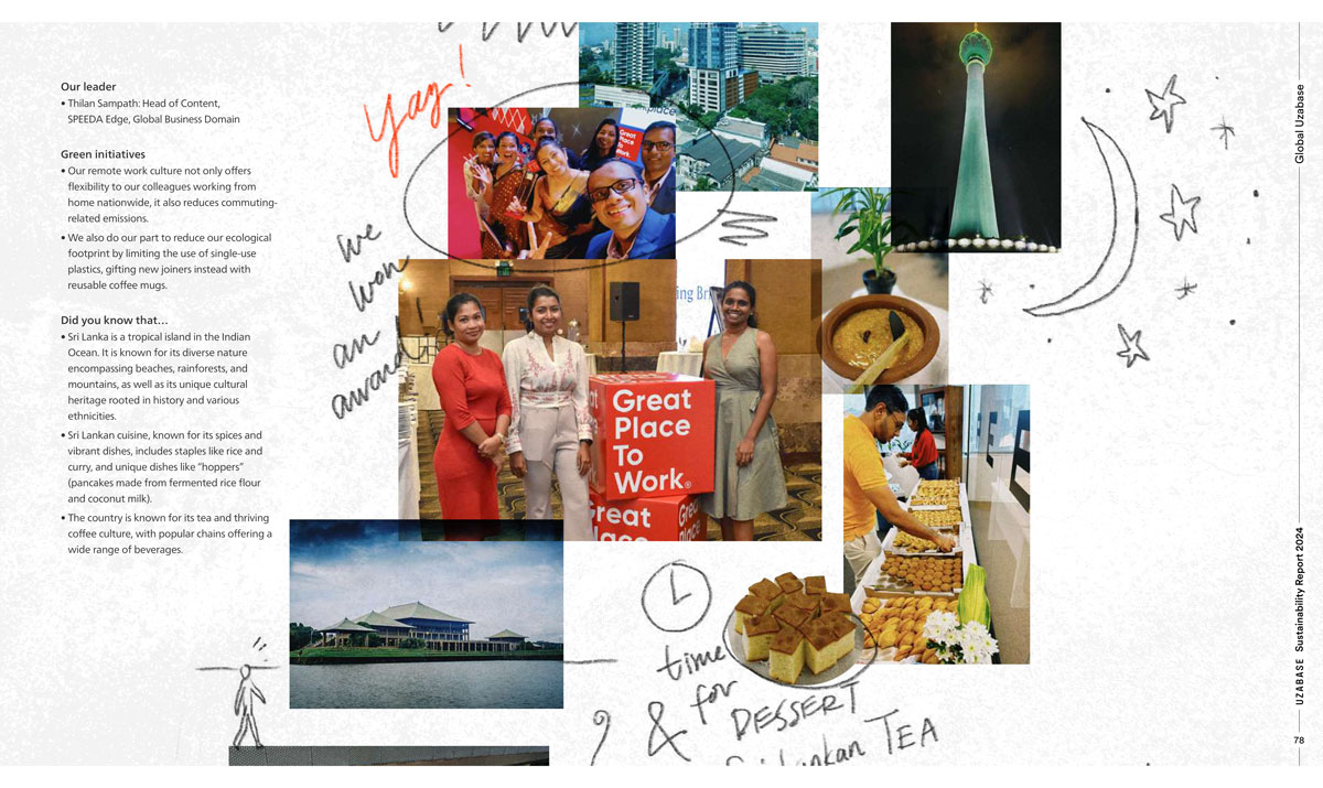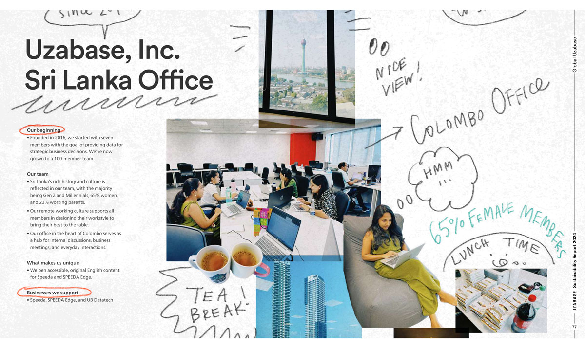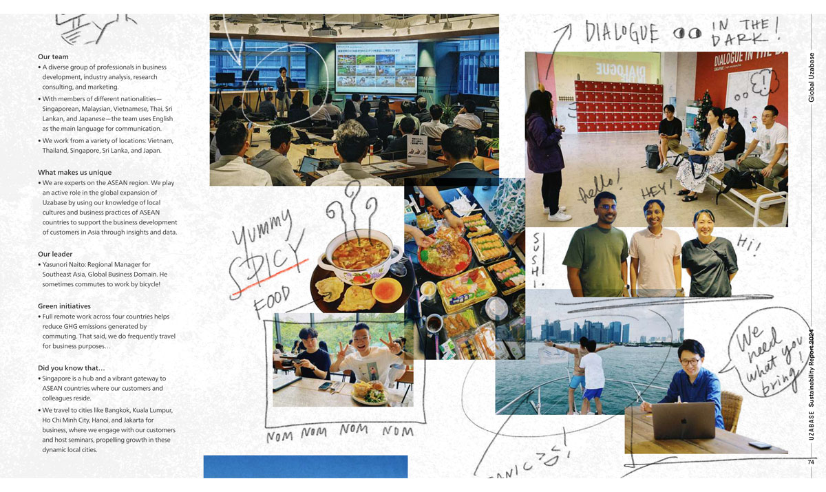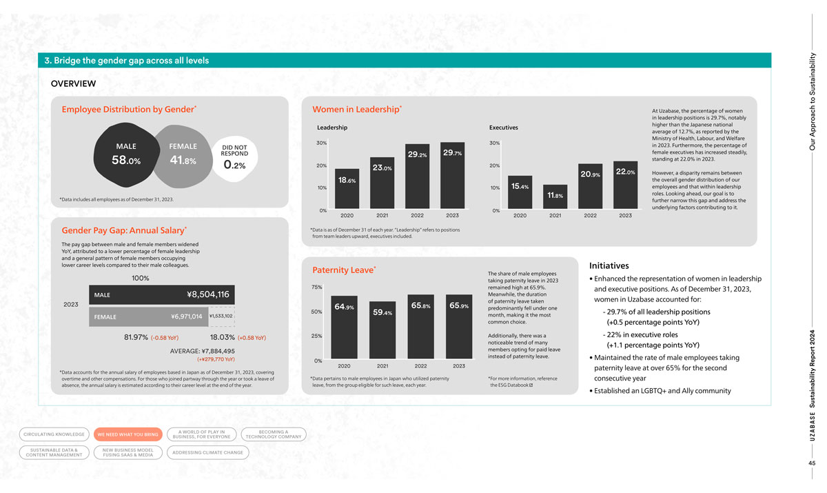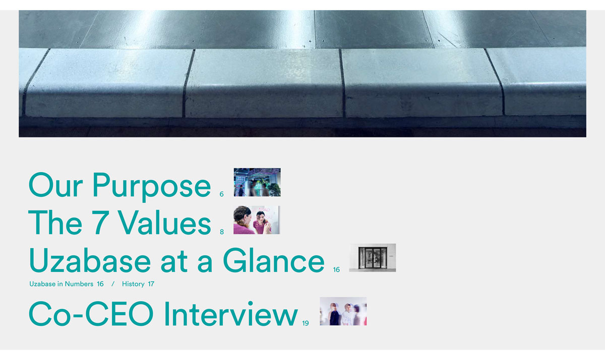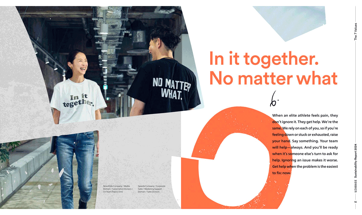 Uzabase’s 2024 sustainability report offers a screen-first horizontal design and a variety of photographic treatments to tell its story.