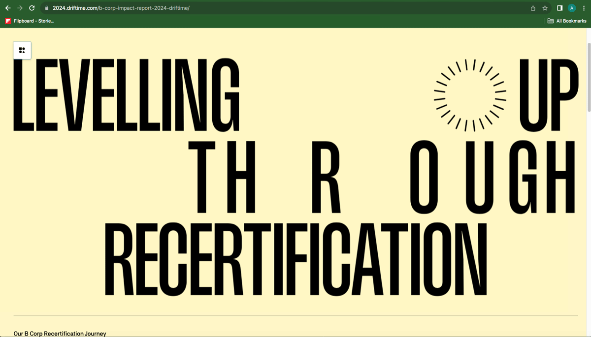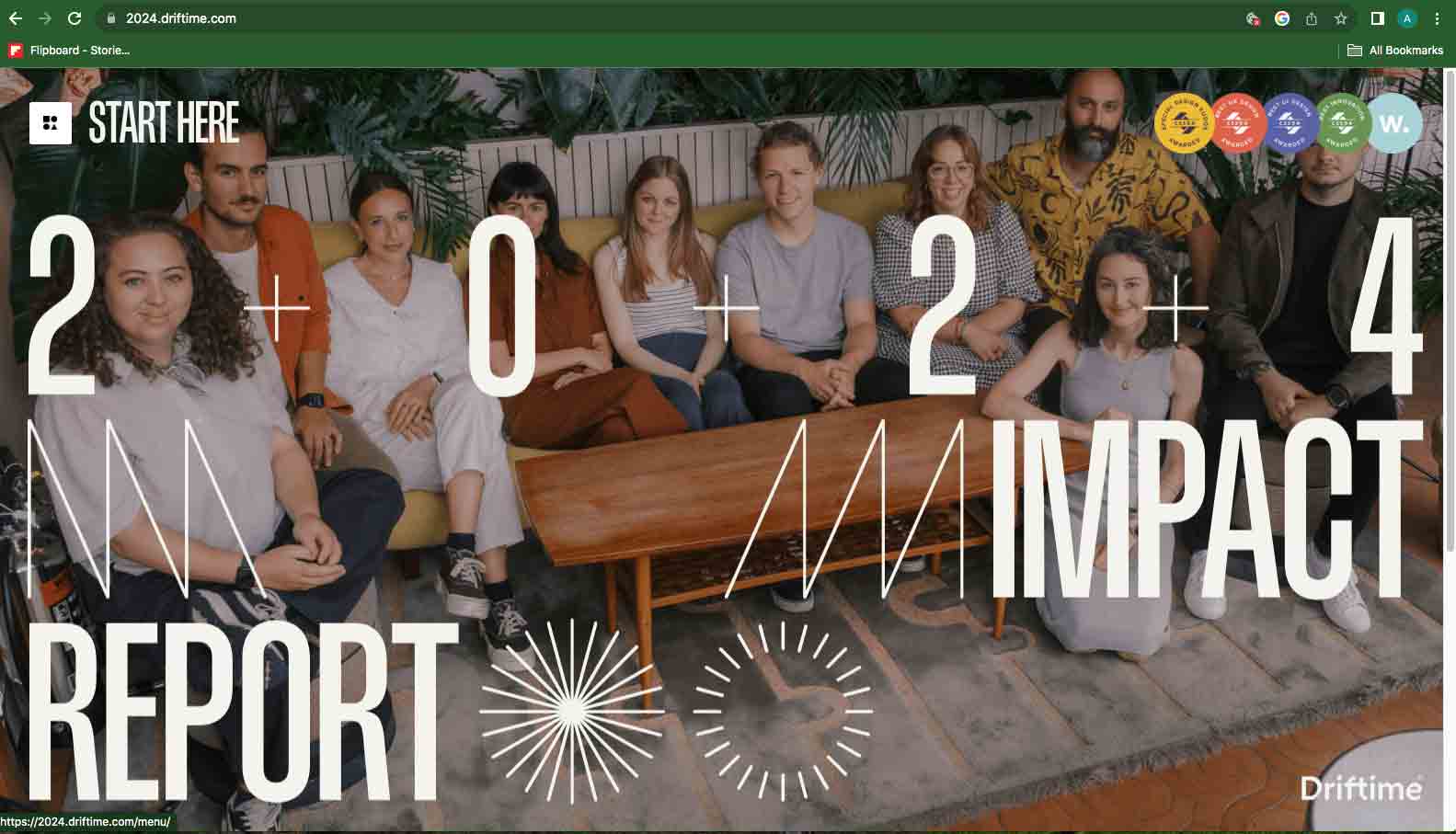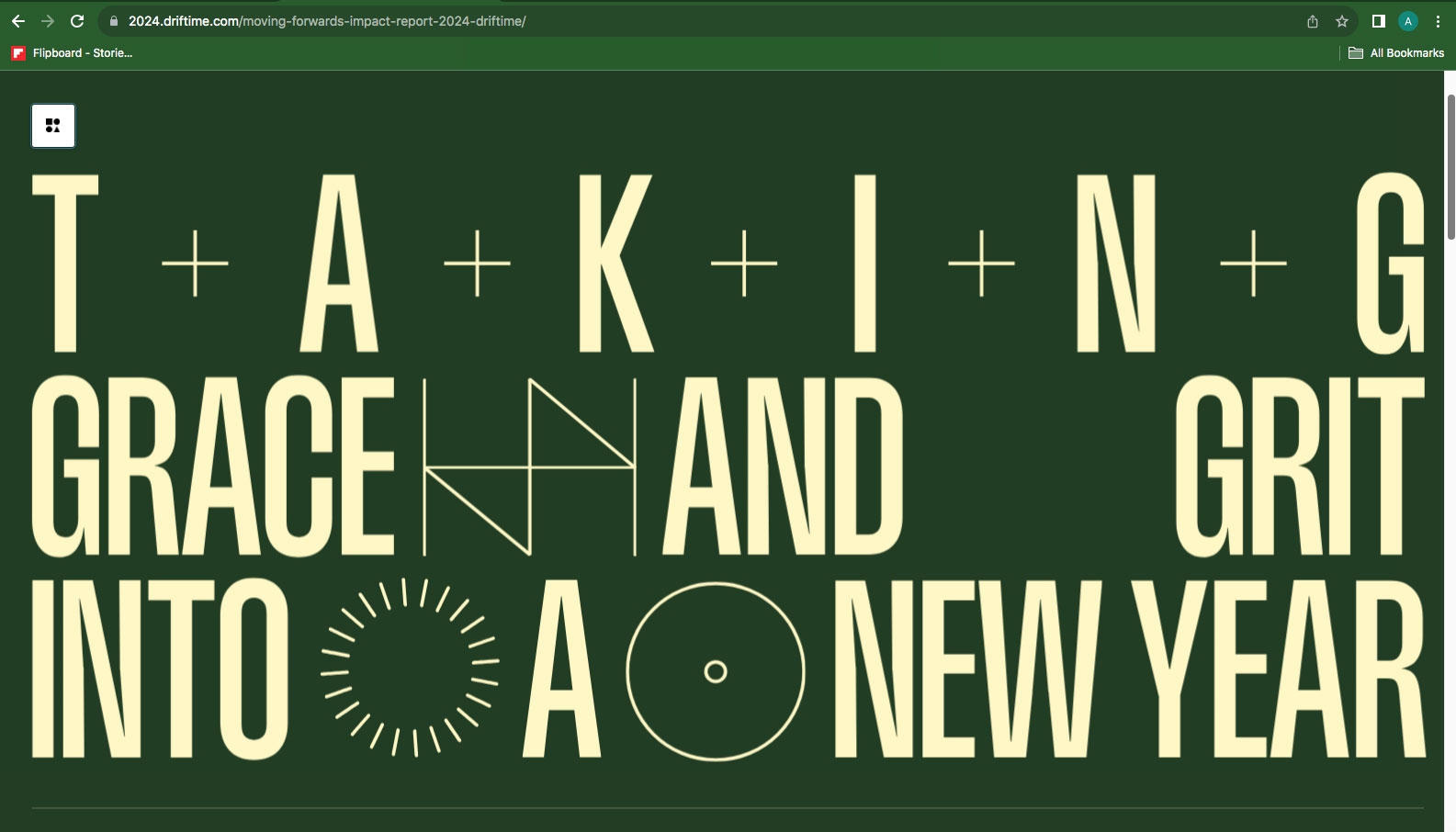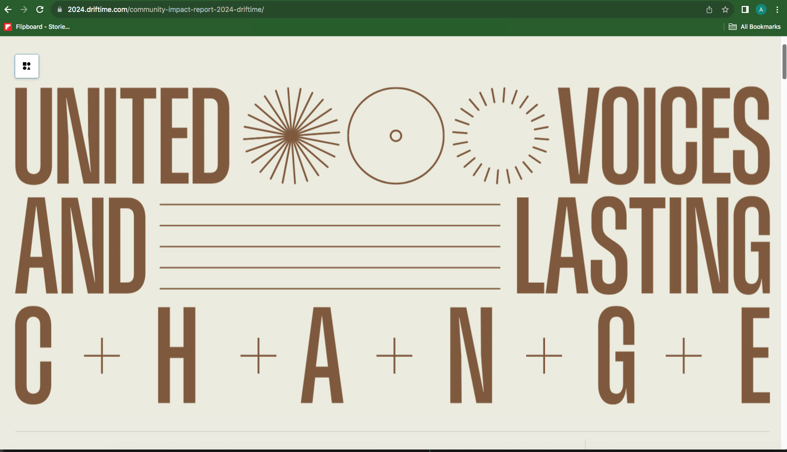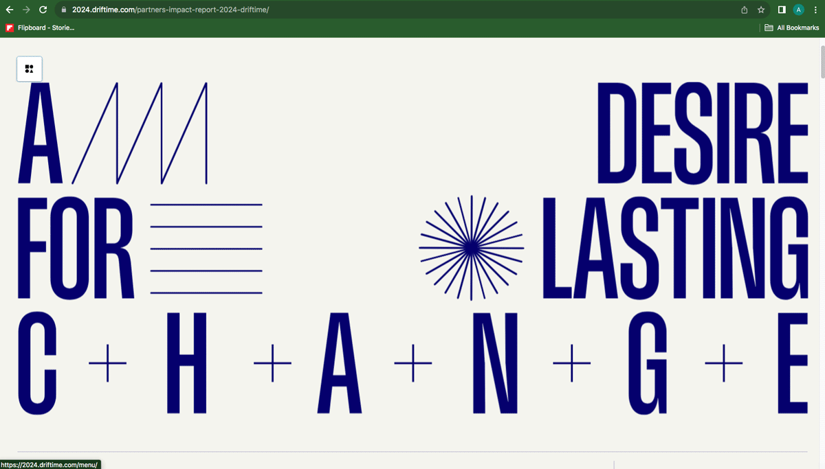 Driftime’s 2024 impact report takes the form of a beautifully designed website. The site opens on a black and white page with nine section titles set in a narrow, bold sans serif. Hovering over each one brings up a brief explanation set in a modern serif. These two typefaces are used throughout the report and make a pleasing pairing.