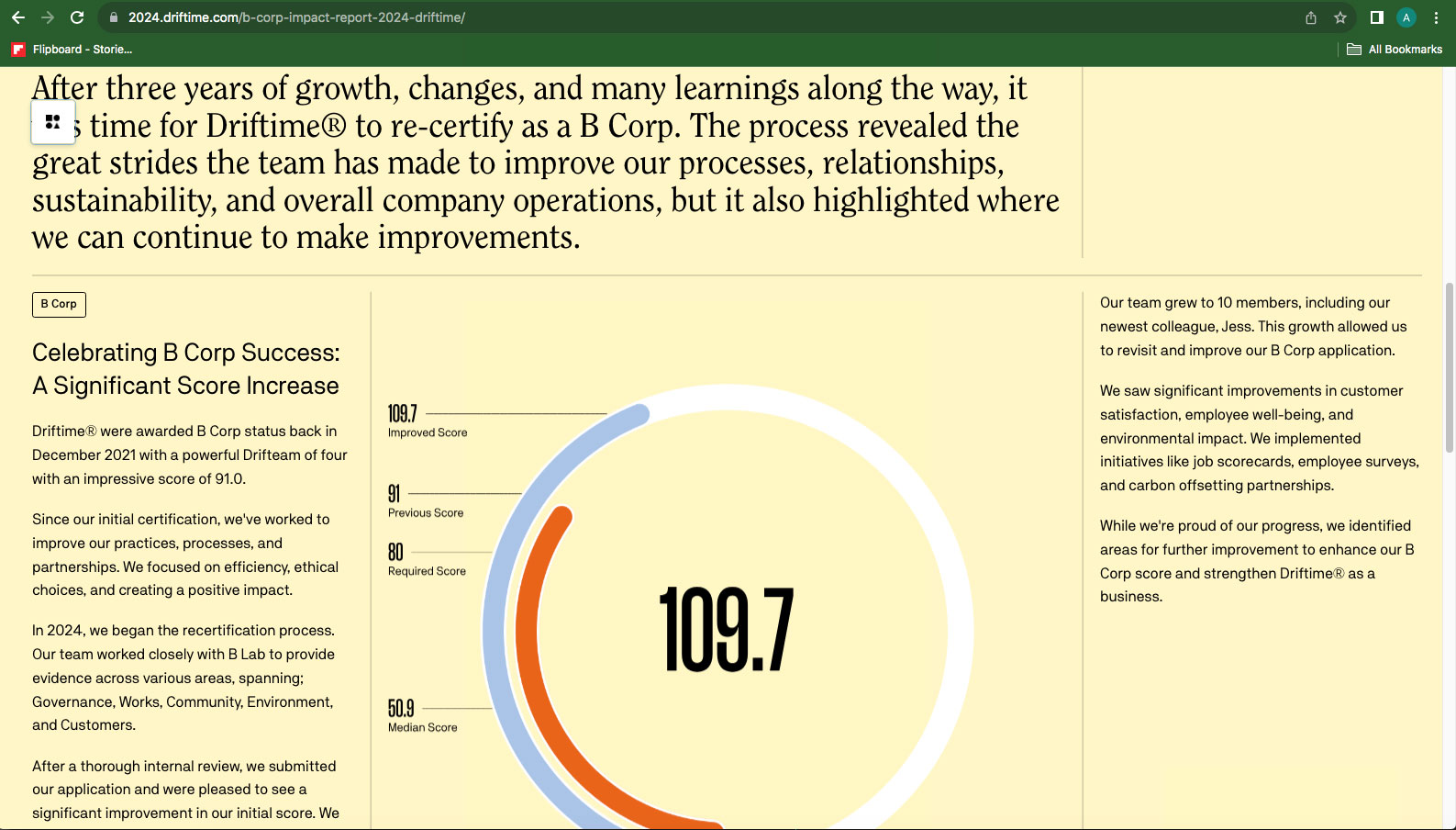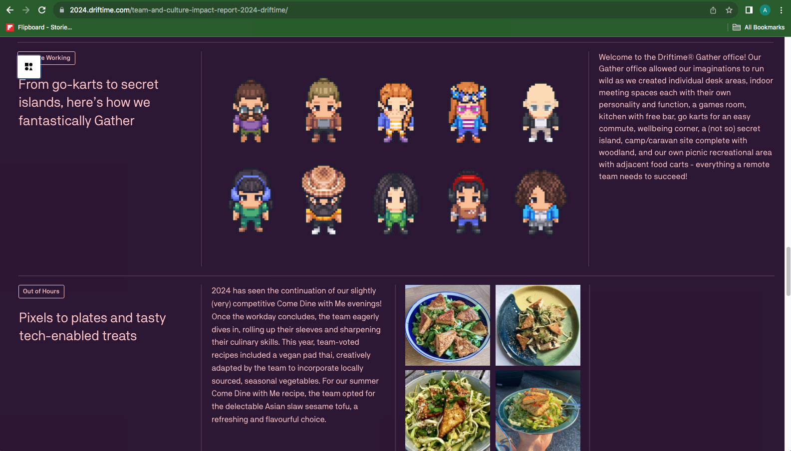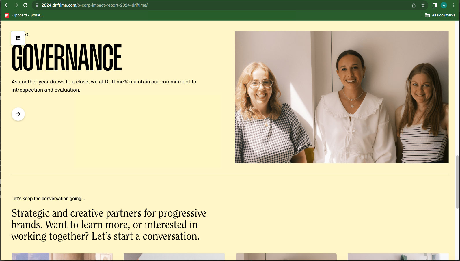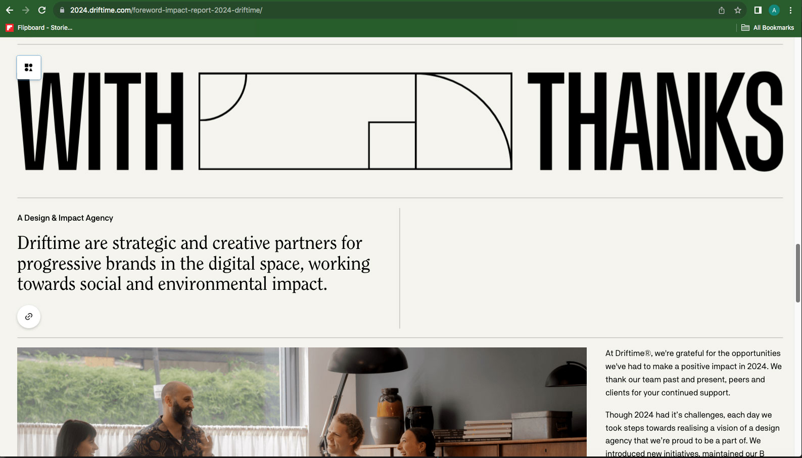 Driftime’s 2024 impact report takes the form of a beautifully designed website. The site opens on a black and white page with nine section titles set in a narrow, bold sans serif. Hovering over each one brings up a brief explanation set in a modern serif. These two typefaces are used throughout the report and make a pleasing pairing.