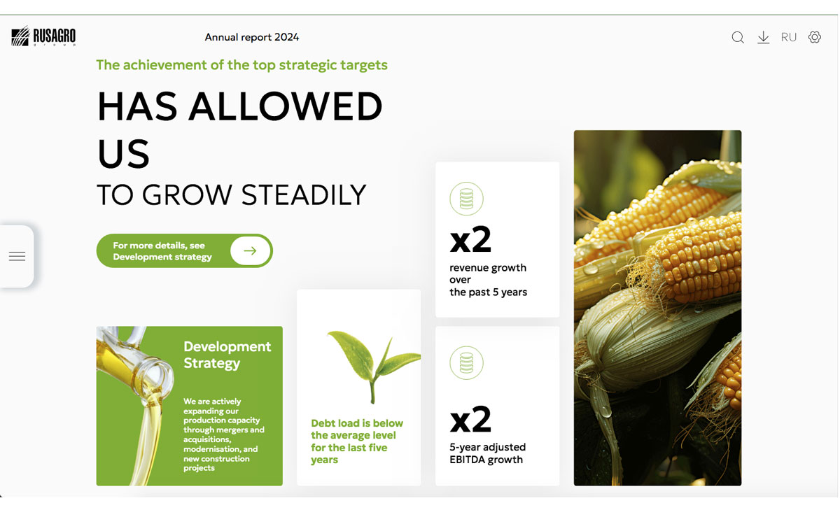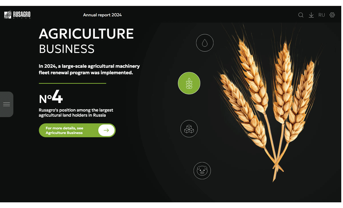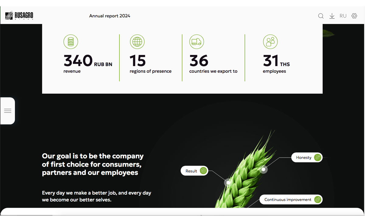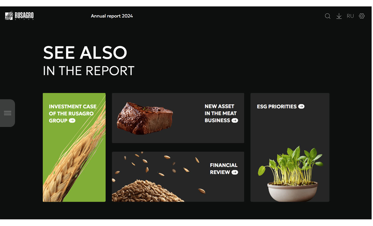 Rusagro’s 2024 uses colour and motion effectively as navigational tools. The report is designed as a website and the main page is divided into black and white sections. Each section fills the screen as the reader swipes downwards. Within each section, colour changes between subsections as the reader swipes: simple and effective, as the reader is presented with a contained block of information at eat swipe.