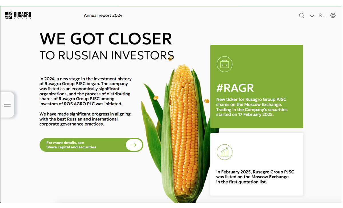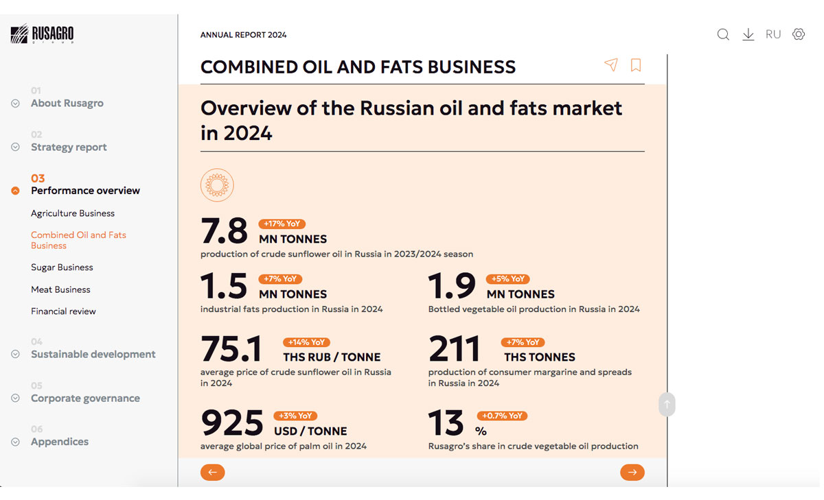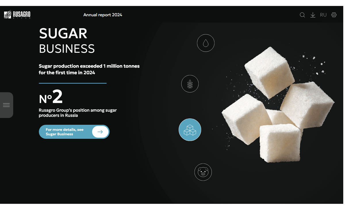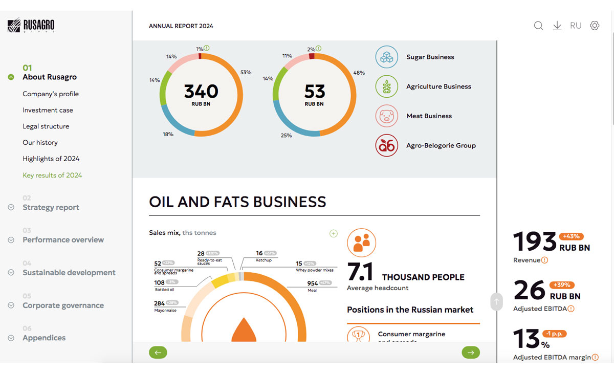 Rusagro’s 2024 uses colour and motion effectively as navigational tools. The report is designed as a website and the main page is divided into black and white sections. Each section fills the screen as the reader swipes downwards. Within each section, colour changes between subsections as the reader swipes: simple and effective, as the reader is presented with a contained block of information at eat swipe.