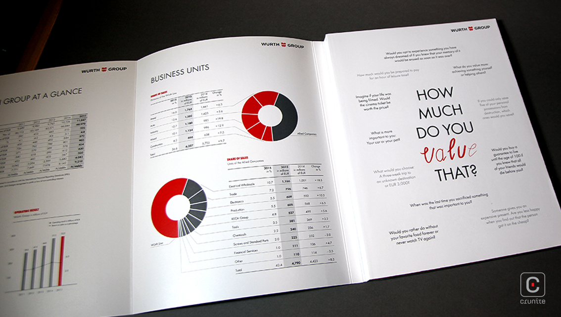 In 2015, the Wurth Group share its financial worth using an illustrative language. The annual report primarily depicts the story of its first product –the screw– the tale of which is told and retold over doodles, text and the fusion of red with white. The front cover is dominated by a block of red, on which the word ‘understanding’ appears with a spot varnish. Below this, ‘value’ is scribbled using a brush stroke font, introducing the theme for the rest of the report.