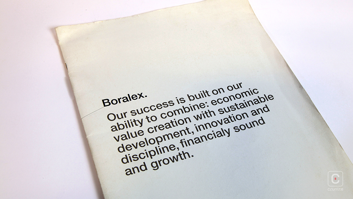 The corporate portraits take an interesting approach to the chairman and CEO. Each gets a page to themselves and the slightly jarring effect of seeing what is essentially a passport-style headshot blown up to full-page is softened by the photographic treatment. Shadows have been stripped away in favour of soft mid-tones and highlights, creating an airy page. The pale gray text superimposed on the face serves to further lighten the page.